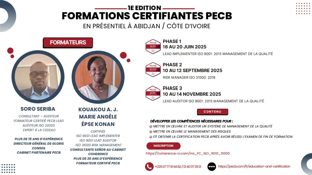 Soro Seriba et Kouakou A. J. Marie Angèle épse Konan, experts certifiés PECB avec plus de 15 ans d'expérience, organisent 3 sessions de formations certifiantes en présentiel à Abidjan, avec la possibilité d’obtenir une certification internationale PECB après examen.